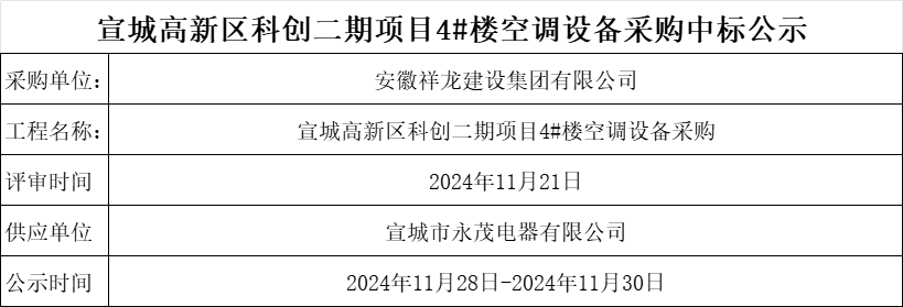 宣城高新區科創二期項目4#樓空調設備采購中標公示